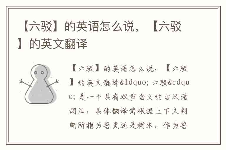 “六驳”是一个具有双重含义的古汉语词汇,具体翻译需根据上下文判断所指为兽类还是树木。作为兽名时,它指一种传说中形似马、牙齿锐利能食虎豹的猛兽;作为树木名时,则特指树皮青白相间、纹理斑驳的梓榆。
