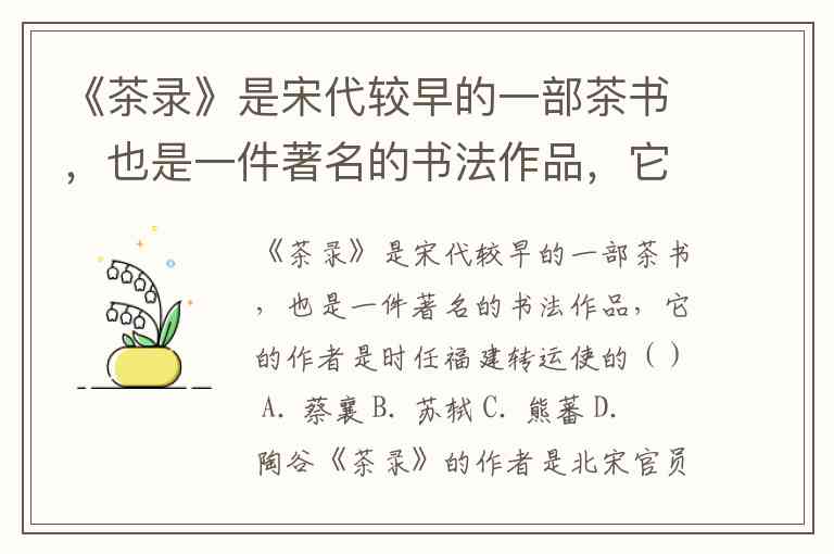《茶录》是宋代较早的一部茶书,也是一件著名的书法作品,它的作者是时任福建转运使的() A. 蔡襄 B. 苏轼 C. 熊蕃 D. 陶谷