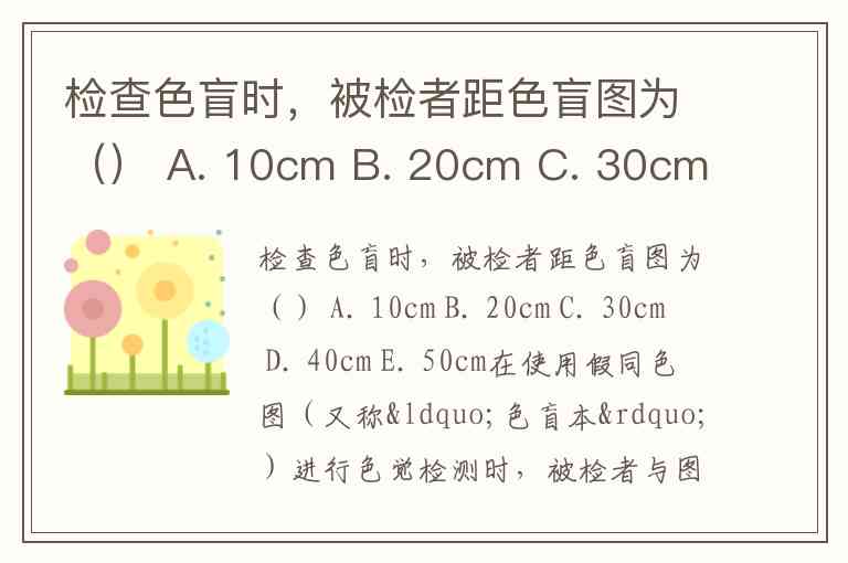 检查色盲时,被检者距色盲图为() A. 10cm B. 20cm C. 30cm D. 40cm E. 50cm
