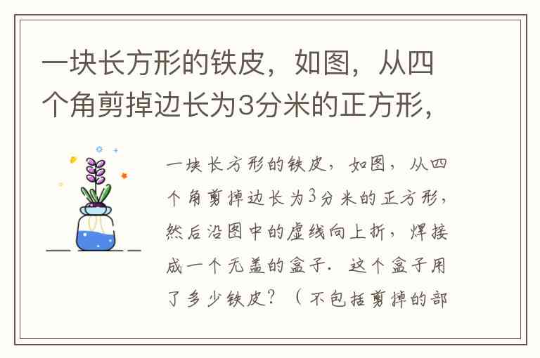 要解决这个问题,需先明确原始长方形铁皮的长和宽(题目中可能遗漏具体尺寸,以下以常见题型数据为例:假设原始长方形铁皮长24分米、宽18分米)。核心思路是:用铁皮面积等于原始面积减去剪掉的4个正方形面积;盒子容积则由折成后长方体的长、宽、高计算得出(高为剪掉的正方形边长3分米)。