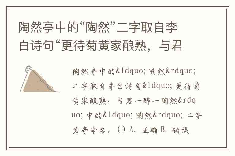 陶然亭中的“陶然”二字取自李白诗句“更待菊黄家酿熟,与君一醉一陶然”中的“陶然”二字为亭命名。( ) A. 正确 B. 错误