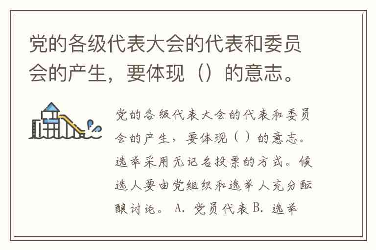 党的各级代表大会的代表和委员会的产生,要体现()的意志。选举采用无记名投票的方式。候选人要由党组织和选举人充分酝酿讨论。 A. 党员代表 B. 选举人 C. 党组织 D. 全体人民