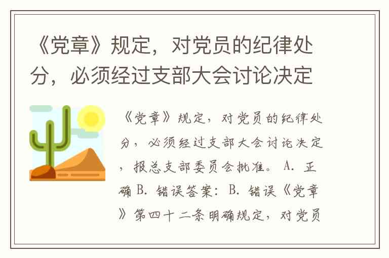 《党章》规定,对党员的纪律处分,必须经过支部大会讨论决定,报总支部委员会批准。 A. 正确 B. 错误