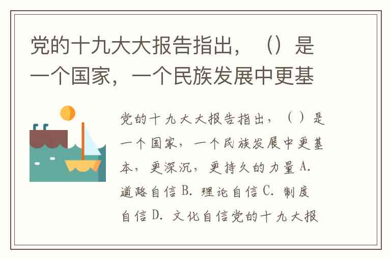党的十九大大报告指出,()是一个国家,一个民族发展中更基本,更深沉,更持久的力量 A. 道路自信 B. 理论自信 C. 制度自信 D. 文化自信