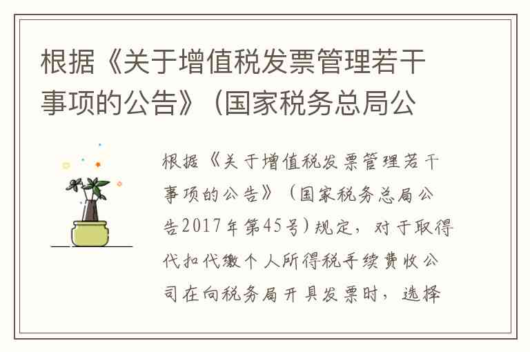 国家税务总局公告2017年第45号的核心内容是自2018年1月1日起推行商品和服务税收分类编码简称,要求纳税人通过增值税发票管理新系统开具发票时,系统自动显示并打印编码对应的简称在票面“货物或应税劳务、服务名称”或“项目”栏次中。然而,该公告仅规定了编码简称的显示要求,并未直接明确代扣代缴个人所得税手续费收入对应的具体编码简称。