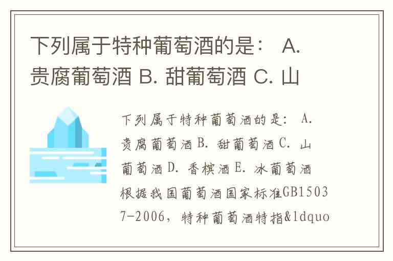 根据我国葡萄酒国家标准GB15037-2006,特种葡萄酒特指“用鲜葡萄或葡萄汁在采摘或酿造工艺中使用特定方法酿制而成的葡萄酒”,核心特征在于特殊工艺而非普通分类属性。题目中属于特种葡萄酒的选项为:A.贵腐葡萄酒、C.山葡萄酒、E.冰葡萄酒。以下是具体分析: