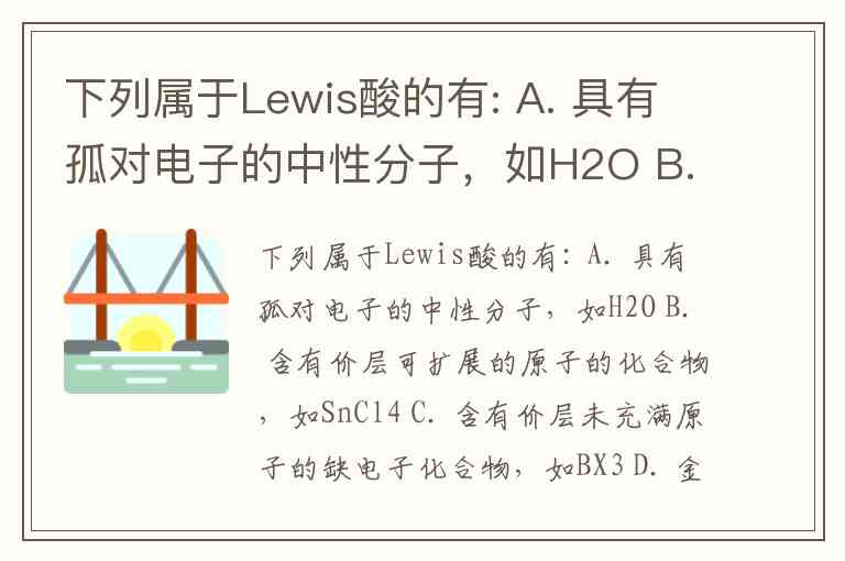 下列属于Lewis酸的有: A. 具有孤对电子的中性分子,如H2O B. 含有价层可扩展的原子的化合物,如SnCl4 C. 含有价层未充满原子的缺电子化合物,如BX3 D. 金属阳离子,如Cu2+,金属离子包含有可用于成键的未被占据的价轨道;