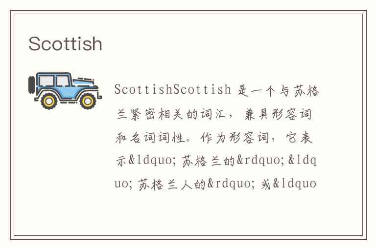 Scottish 是一个与苏格兰紧密相关的词汇,兼具形容词和名词词性。作为形容词,它表示“苏格兰的”“苏格兰人的”或“苏格兰语的”,用于描述与苏格兰相关的事物、人群或语言特征。例如,“Scottish mountains”(苏格兰山脉)或“Scottish authors”(苏格兰作家),这一用法在正式语境中更为常见。作为名词时,它可指代“苏格兰人”或“苏格兰语”,其中苏格兰语既包括苏格兰盖尔语(Gaelic),也涵盖苏格兰地区使用的英语方言(Scots English)。