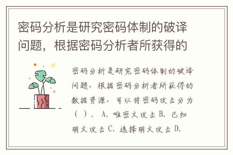 密码分析是研究密码体制的破译问题,根据密码分析者所获得的数据资源,可以将密码攻击分为( )。 A. 唯密文攻击 B. 已知明文攻击 C. 选择明文攻击 D. 选择密文攻击