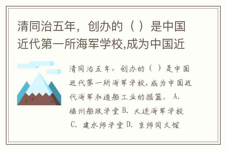 清同治五年,创办的( )是中国近代第一所海军学校,成为中国近代海军和造船工业的摇篮。 A. 福州船政学堂 B. 大连海军学校 C. 建水师学堂 D. 京师同文馆