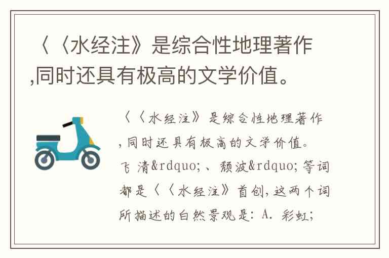 〈〈水经注》是综合性地理著作,同时还具有极高的文学价值。 飞 清”、颓波”等词都是〈〈水经注》首创,这两个词所描述的白然景观是: A. 彩虹; B. 溶洞; C. 海市蜃楼; D. 瀑布。