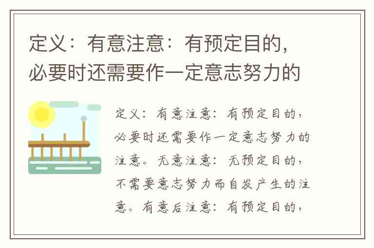 要判断典型行为中属于有意注意的数量,需先明确三类注意的核心区别:有意注意需同时满足“有预定目的”和“必要时需意志努力”;无意注意无目的且无需意志努力;有意后注意有目的但无需意志努力。