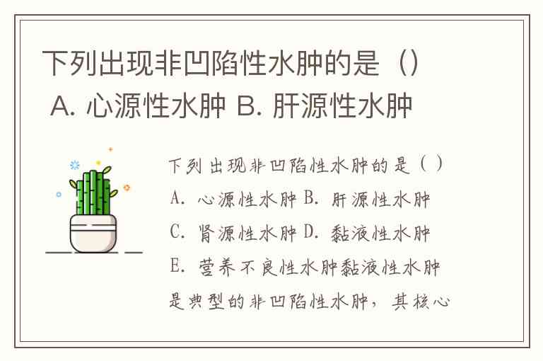下列出现非凹陷性水肿的是() A. 心源性水肿 B. 肝源性水肿 C. 肾源性水肿 D. 黏液性水肿 E. 营养不良性水肿