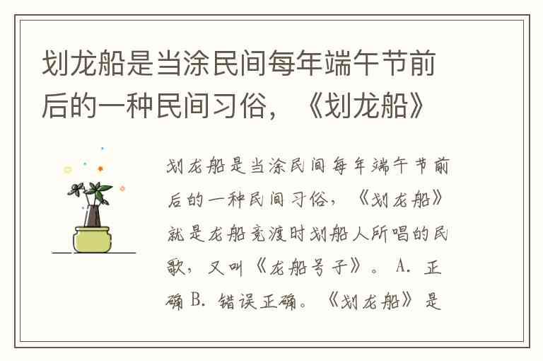划龙船是当涂民间每年端午节前后的一种民间习俗,《划龙船》就是龙船竞渡时划船人所唱的民歌,又叫《龙船号子》。 A. 正确 B. 错误