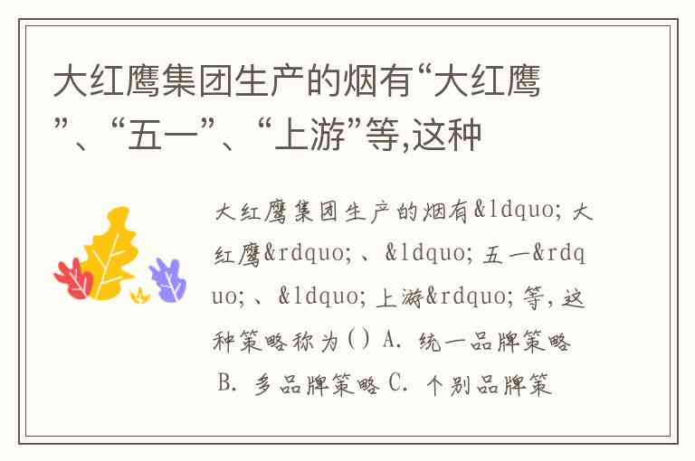 大红鹰集团生产的烟有“大红鹰”、“五一”、“上游”等,这种策略称为( ) A. 统一品牌策略 B. 多品牌策略 C. 个别品牌策略 D. 品牌扩展策略