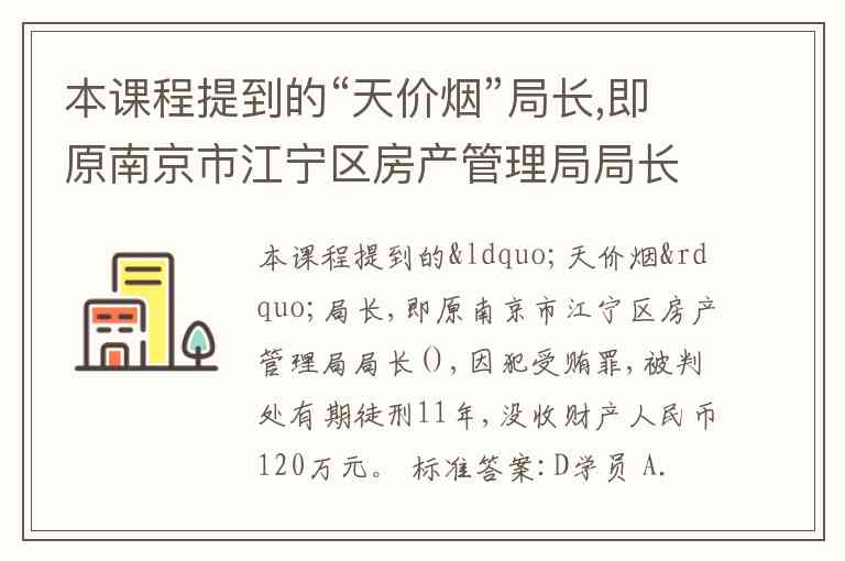 本课程提到的“天价烟”局长,即原南京市江宁区房产管理局局长(),因犯受贿罪,被判处有期徒刑11年,没收财产人民币120万元。 标准答案:D学员 A. B. 邱晓华 C. 林嘉祥 D. 周久耕