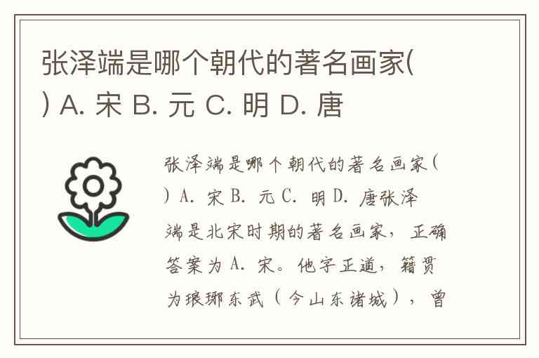 张泽端是哪个朝代的著名画家( ) A. 宋 B. 元 C. 明 D. 唐