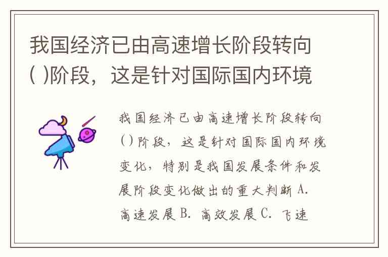 我国经济已由高速增长阶段转向( )阶段,这是针对国际国内环境变化,特别是我国发展条件和发展阶段变化做出的重大判断 A. 高速发展 B. 高效发展 C. 飞速发展 D. 高质量发展