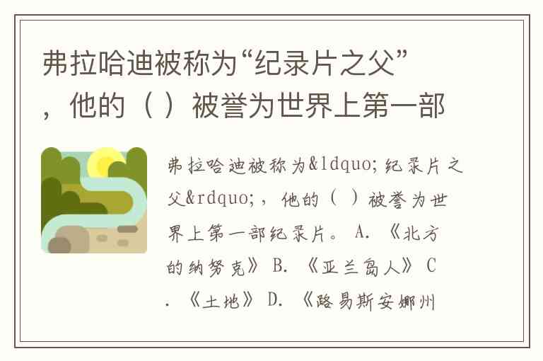 弗拉哈迪被称为“纪录片之父”,他的( )被誉为世界上第一部纪录片。 A. 《北方的纳努克》 B. 《亚兰岛人》 C. 《土地》 D. 《路易斯安娜州的故事》