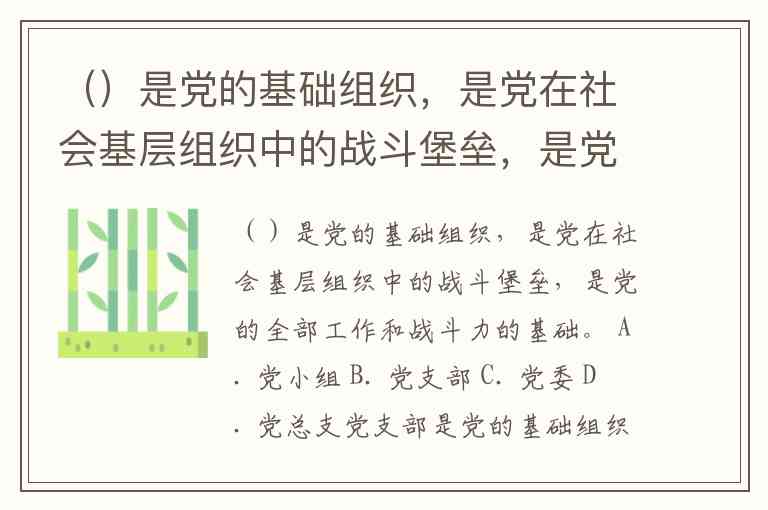 ()是党的基础组织,是党在社会基层组织中的战斗堡垒,是党的全部工作和战斗力的基础。 A. 党小组 B. 党支部 C. 党委 D. 党总支