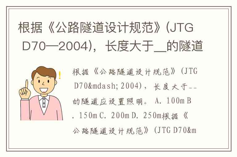 根据《公路隧道设计规范》(JTG D70—2004),长度大于__的隧道应设置照明。 A. 100m B. 150m C. 200m D. 250m