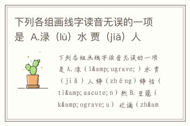 下列各组画线字读音无误的一项是 A.渌(lù)水 贾(jiǎ)人 铮(zhēng)铮 恬(tián)然 B.豆蔻(kòu) 迁谪(zhé) 訇(hōng)然 嘲哳(zhā) C.青冥(míng) 钿(tiàn)头 迸(bèng)裂 浣(huàn)纱 D.魂悸(jì) 暮霭(ǎi) 教坊(fáng) 纶(lún)巾
