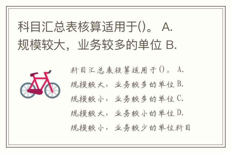 科目汇总表核算适用于()。 A. 规模较大,业务较多的单位 B. 规模较小,业务较多的单位 C. 规模较大,业务较小的单位 D. 规模较小,业务较少的单位