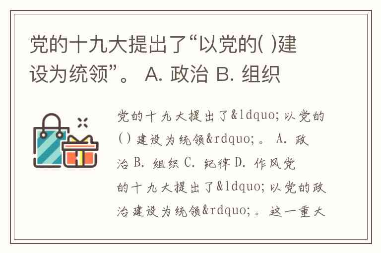 党的十九大提出了“以党的( )建设为统领”。 A. 政治 B. 组织 C. 纪律 D. 作风