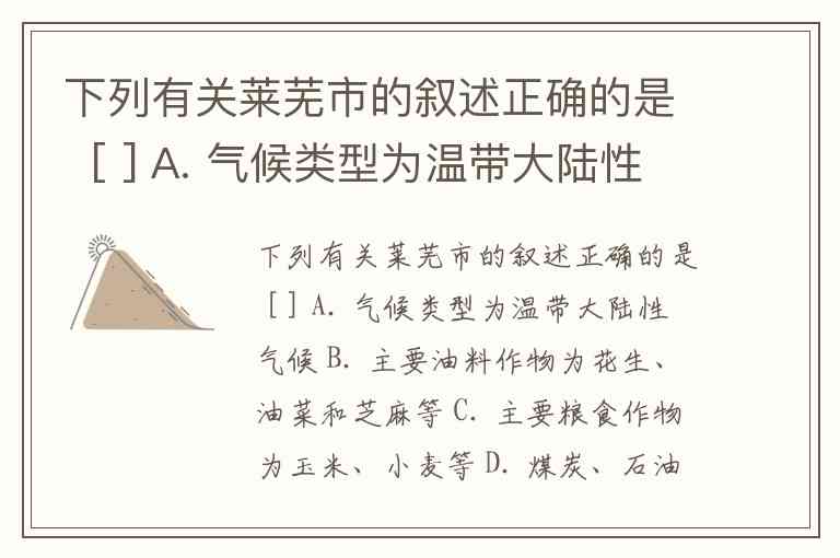 下列有关莱芜市的叙述正确的是 [ ] A. 气候类型为温带大陆性气候 B. 主要油料作物为花生、油菜和芝麻等 C. 主要粮食作物为玉米、小麦等 D. 煤炭、石油、水能资源丰富
