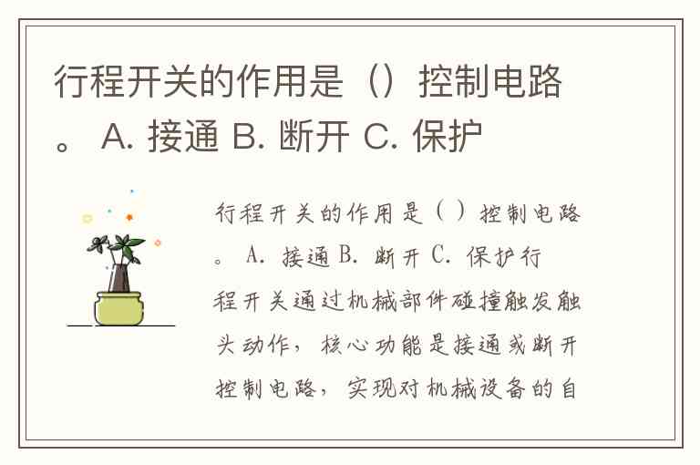 行程开关的作用是()控制电路。 A. 接通 B. 断开 C. 保护