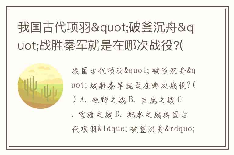我国古代项羽"破釜沉舟"战胜秦军就是在哪次战役?( ) A. 牧野之战 B. 巨鹿之战 C. 官渡之战 D. 淝水之战