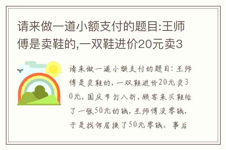 请来做一道小额支付的题目:王师傅是卖鞋的,一双鞋进价20元卖30元,国庆节打八折,顾客来买鞋给了一张50元的钱,王师傅没零钱,于是找邻居换了50元零钱。事后邻居发现钱是假的,王师傅又赔了邻居50元。请问王师傅一共亏了多少钱? A. 96 B. 70 C. 46 D. 50