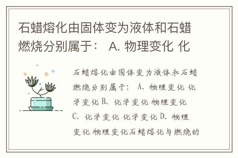 石蜡熔化由固体变为液体和石蜡燃烧分别属于: A. 物理变化 化学变化 B. 化学变化 物理变化 C. 化学变化 化学变化 D. 物理变化 物理变化