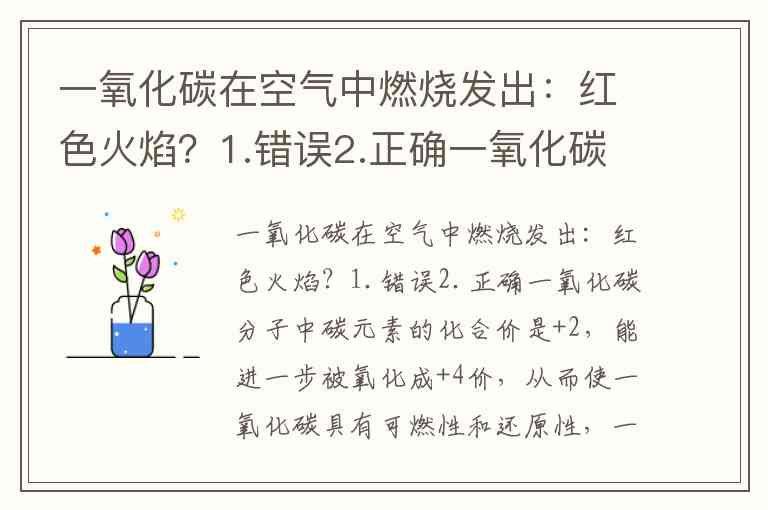 一氧化碳在空气中燃烧发出的是蓝色火焰,而非红色火焰。其分子中碳元素为+2价,具有可燃性,燃烧时与氧气反应生成二氧化碳(碳元素被氧化为+4价),同时释放大量热量并产生特征性的蓝色火焰,这一性质使一氧化碳可用作气体燃料。题目中“红色火焰”的描述与事实不符。