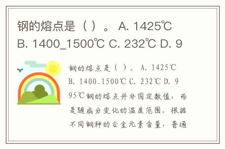 钢的熔点是( )。 A. 1425℃ B. 1400_1500℃ C. 232℃ D. 995℃
