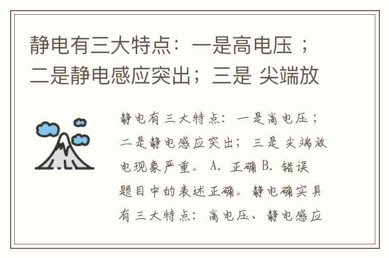 题目中的表述正确。静电确实具有三大特点:高电压、静电感应突出和尖端放电现象严重。这一结论在多个权威来源中得到验证,例如明确指出静电三大特点为电压高、静电感应突出和尖端放电现象严重。