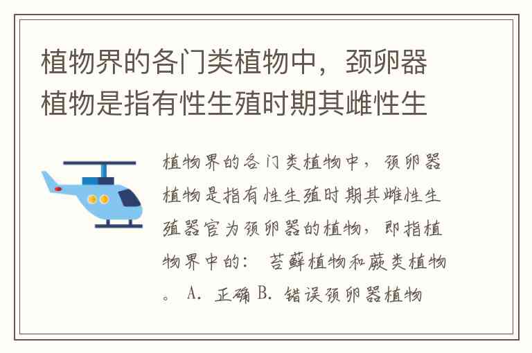 植物界的各门类植物中,颈卵器植物是指有性生殖时期其雌性生殖器官为颈卵器的植物,即指植物界中的: 苔藓植物和蕨类植物。 A. 正确 B. 错误