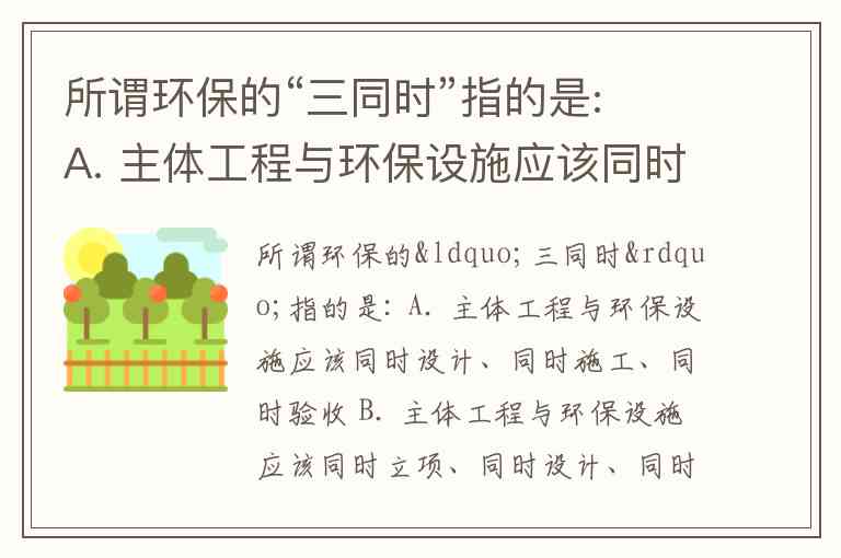 所谓环保的“三同时”指的是: A. 主体工程与环保设施应该同时设计、同时施工、同时验收 B. 主体工程与环保设施应该同时立项、同时设计、同时施工 C. 主体工程与环保设施必需同时设计、同时施工、同时投入使用 D. 主体工程与环保设施必需同时立项、同时施工、同时投入使用