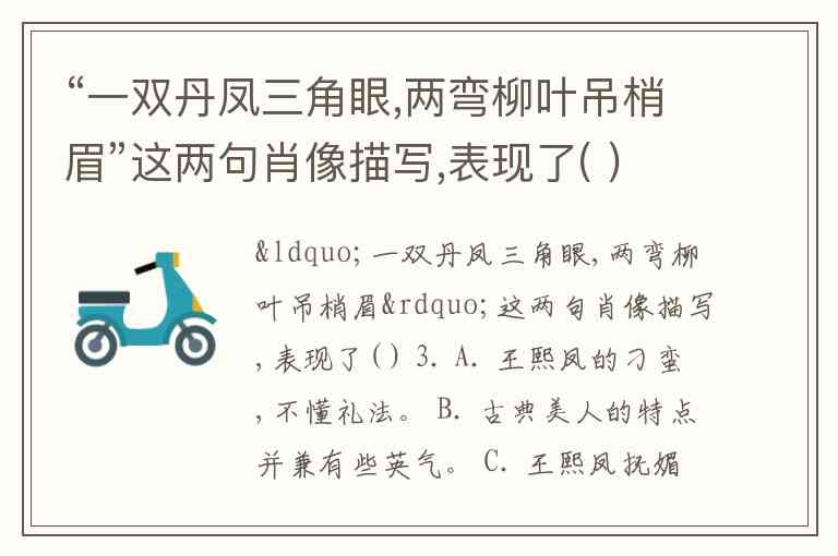 “一双丹凤三角眼,两弯柳叶吊梢眉”这两句肖像描写,表现了( ) 3. A. 王熙凤的刁蛮,不懂礼法。 B. 古典美人的特点并兼有些英气。 C. 王熙凤抚媚智慧。 D. 王熙凤的泼辣、厉害、无情。