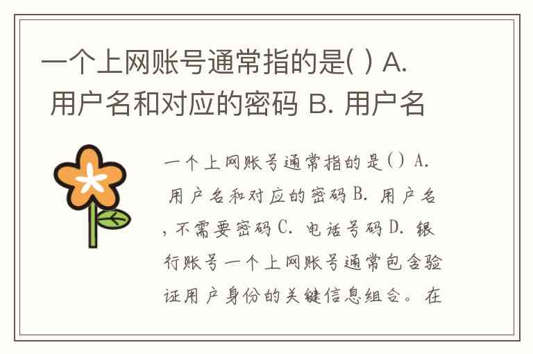 一个上网账号通常指的是( ) A. 用户名和对应的密码 B. 用户名,不需要密码 C. 电话号码 D. 银行账号
