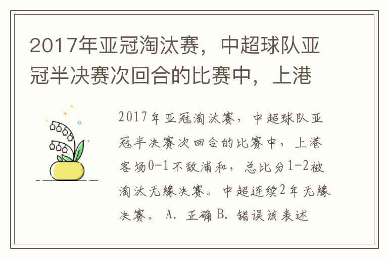 2017年亚冠淘汰赛,中超球队亚冠半决赛次回合的比赛中,上港客场0-1不敌浦和,总比分1-2被淘汰无缘决赛。中超连续2年无缘决赛。 A. 正确 B. 错误