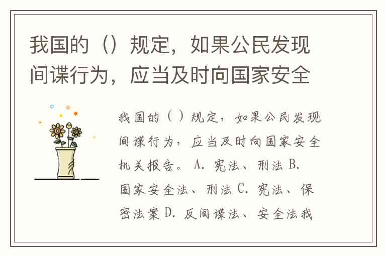 我国的()规定,如果公民发现间谍行为,应当及时向国家安全机关报告。 A. 宪法、刑法 B. 国家安全法、刑法 C. 宪法、保密法案 D. 反间谍法、安全法