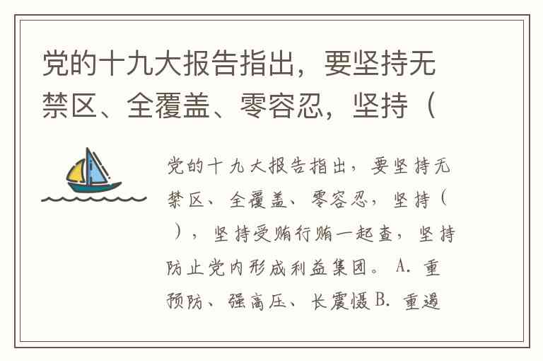 党的十九大报告指出,要坚持无禁区、全覆盖、零容忍,坚持( ),坚持受贿行贿一起查,坚持防止党内形成利益集团。 A. 重预防、强高压、长震慑 B. 重遏制、强高压、长威慑 C. 重遏制、不减压、长震慑 D. 重遏制、强高压、长震慑