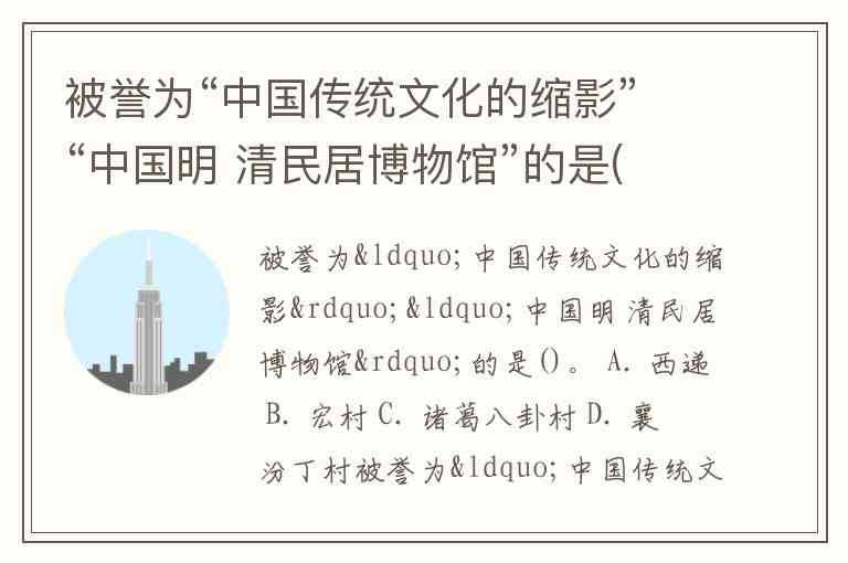 被誉为“中国传统文化的缩影”“中国明 清民居博物馆”的是()。 A. 西递 B. 宏村 C. 诸葛八卦村 D. 襄汾丁村