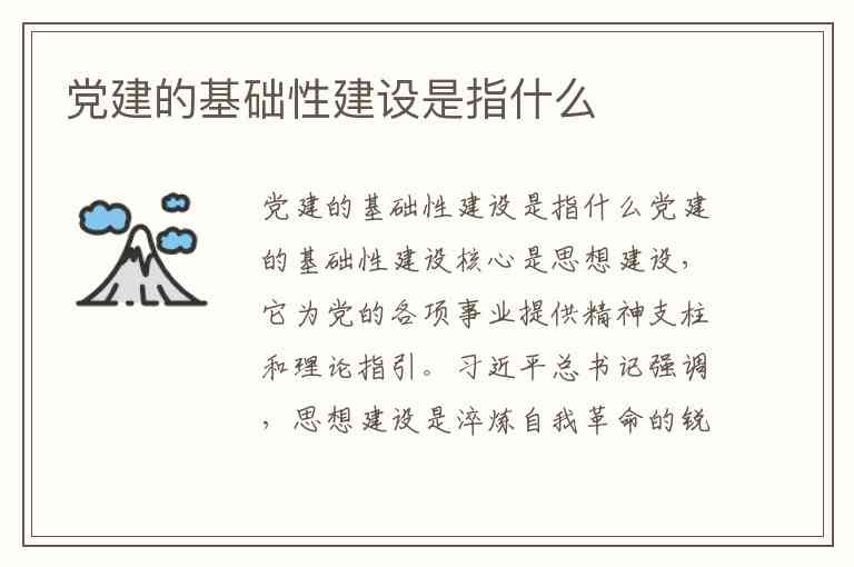 党建的基础性建设核心是思想建设,它为党的各项事业提供精神支柱和理论指引。习近平总书记强调,思想建设是淬炼自我革命的锐利武器,中国共产党之所以能历经磨难而壮大,关键就在于始终重视思想建党、理论强党。这一建设直接关系党的创造力、凝聚力和战斗力,通过理论武装确保全党在思想、政治、行动上高度一致。