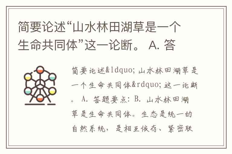 简要论述“山水林田湖草是一个生命共同体”这一论断。 A. 答题要点: B. 山水林田湖草是生命共同体。生态是统一的自然系统,是相互依存、紧密联系的有机链条。人的命脉在田,田的命脉在水,水的命脉在山,山的命脉在土,土的命脉在林和草,这个生命共同体是人类生存发展的物质基础。