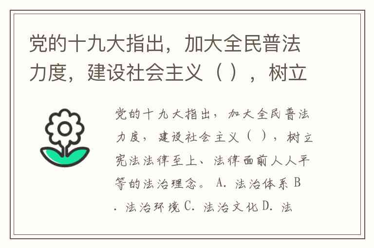 党的十九大指出,加大全民普法力度,建设社会主义( ),树立宪法法律至上、法律面前人人平等的法治理念。 A. 法治体系 B. 法治环境 C. 法治文化 D. 法治制度