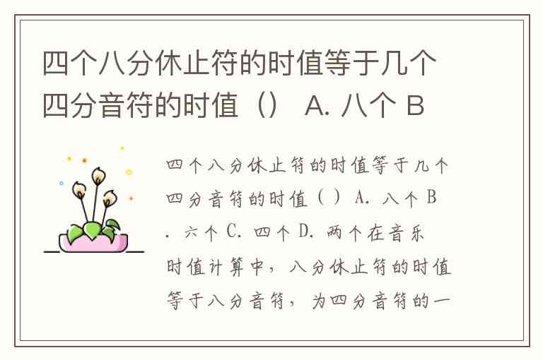 四个八分休止符的时值等于几个四分音符的时值() A. 八个 B. 六个 C. 四个 D. 两个