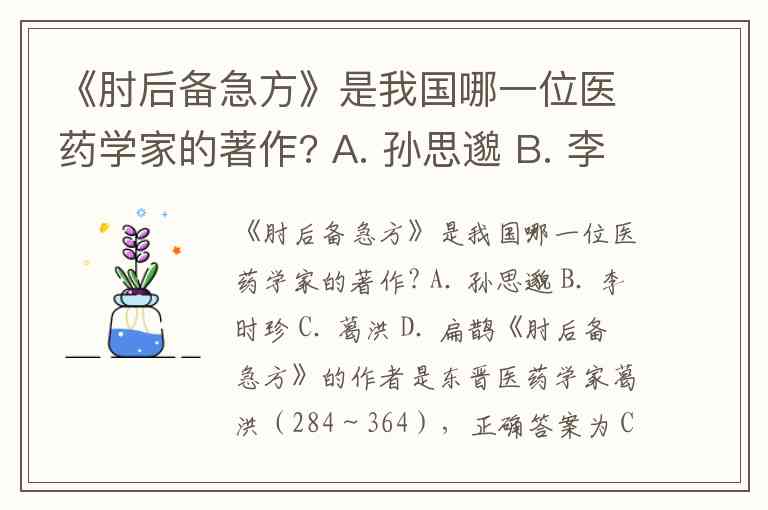 《肘后备急方》是我国哪一位医药学家的著作? A. 孙思邈 B. 李时珍 C. 葛洪 D. 扁鹊