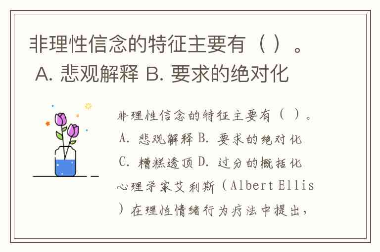 非理性信念的特征主要有( )。 A. 悲观解释 B. 要求的绝对化 C. 糟糕透顶 D. 过分的概括化